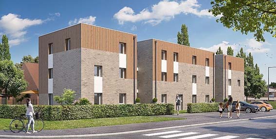 Le programme immobilier Écrin de Ville se situe rue de la Petite Forêt dans un quartier résidentiel en renouveau. L’ensemble, très bien intégré à son environnement, mixe de petits immeubles de 12 appartements de 2 pièces et 22 maisons de 4 pièces. Les matériaux utilisés sont sobres et élégants, mais aussi pérennes. Les espaces arborés et les cheminements piétonniers sont très nombreux. L’architecte du projet est Benjamin Potie (Lille).