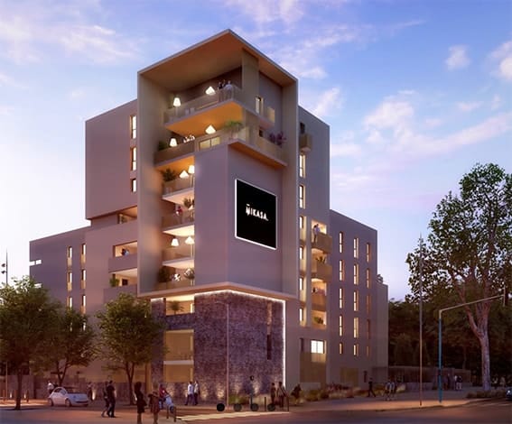 La résidence Mikasa, conçue par l’architecte Nicolas Lebunetel, se compose de 8 étages et de 59 logements du studio au 4 pièces. Elle se situe au 1852 avenue de Toulouse dans l’écoquartier Ovalie. Son architecture audacieuse, mais très bien intégrée à son environnement, accueille des appartements connectés très fonctionnels aux prestations élégantes. Le projet est réalisé en co-promotion avec Icade.