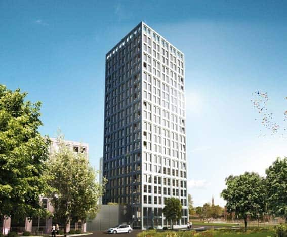 Route de Vienne, près de la place de l’Étoile, en plein cœur de Strasbourg, l’&scape, grande tour sur 17 étages en béton lasuré et bleuté, propose 63 logements du 2 au 6 pièces duplex. Double exposition, loggia semi-ouverte, fenêtre de 2 m de hauteur, les appartements sont lumineux et offrent un magnifique panorama sur la ville.