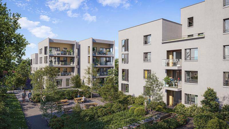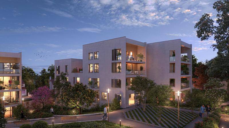 En contrebas, au cœur d’un parc de 2 hectares enrichi de 130 arbres, quatre ilots contemporains se fondent dans l’environnement naturel où patio, terrasse et balcon font entrer le paysage dans les logements.
